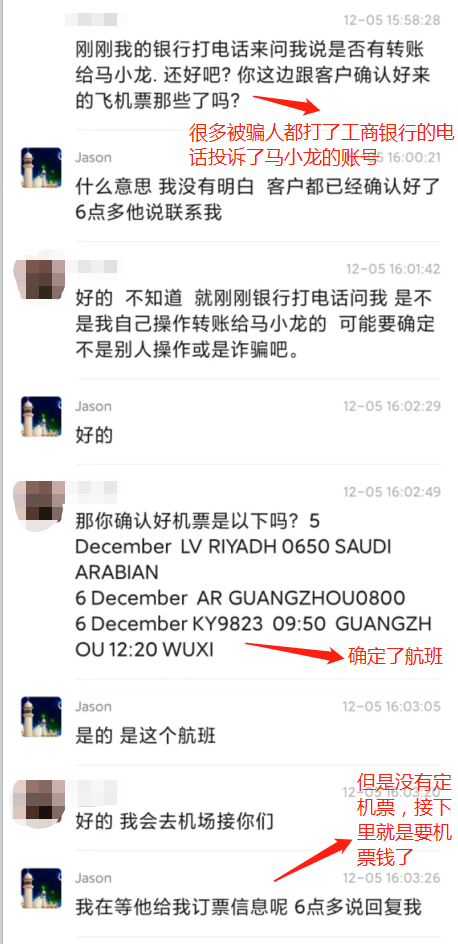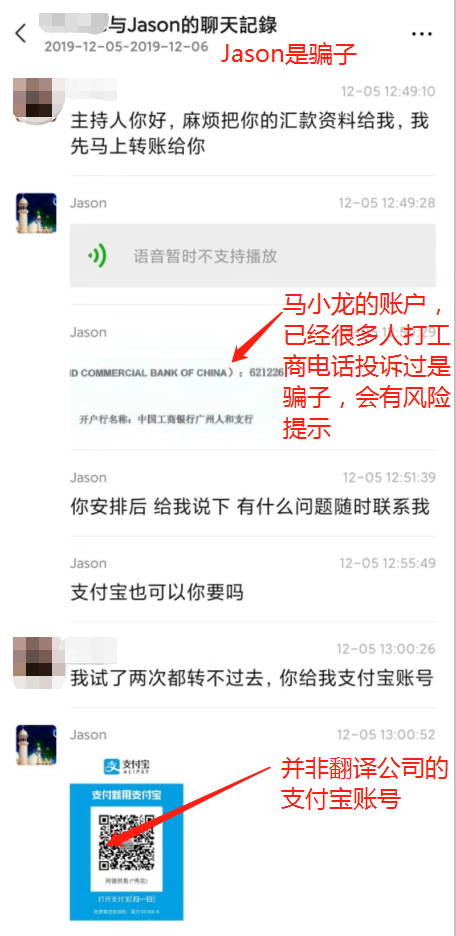 马小龙骗局曝光:阿拉伯语翻译-马小龙-Jason-陈先生是骗子,并非拓谱翻译员工。Jason以中东客户要来拜访为由,联系国内外贸公司。然后请Jason(骗子)为翻译,要国内客户先支付翻译费用给骗子,等中东客户到了以后再把费用给国内外贸公司。